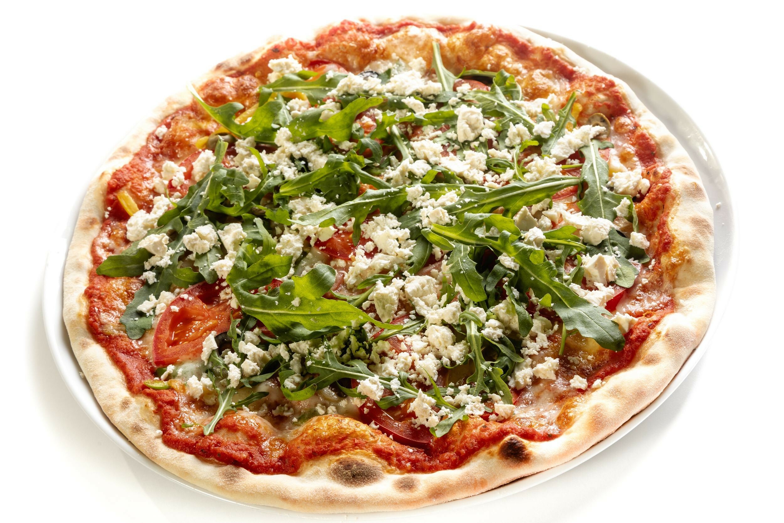 Сыр моцарелла, томатный соус,перец болгарский , помидоры, оливки, маслины, руколла, сыр брынза, орегано, оливковое масло.